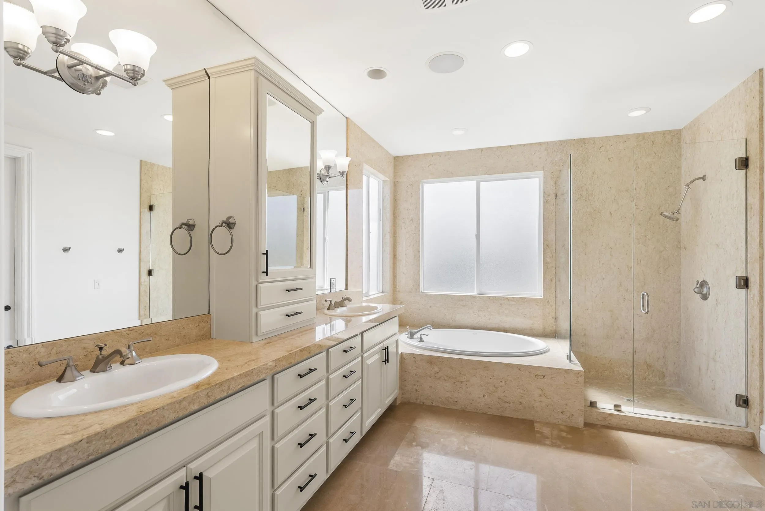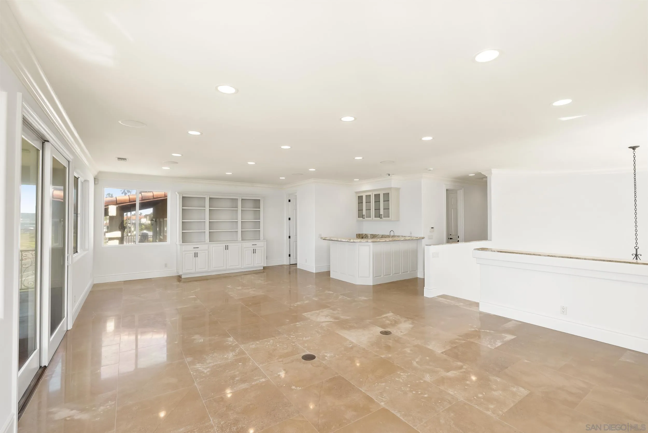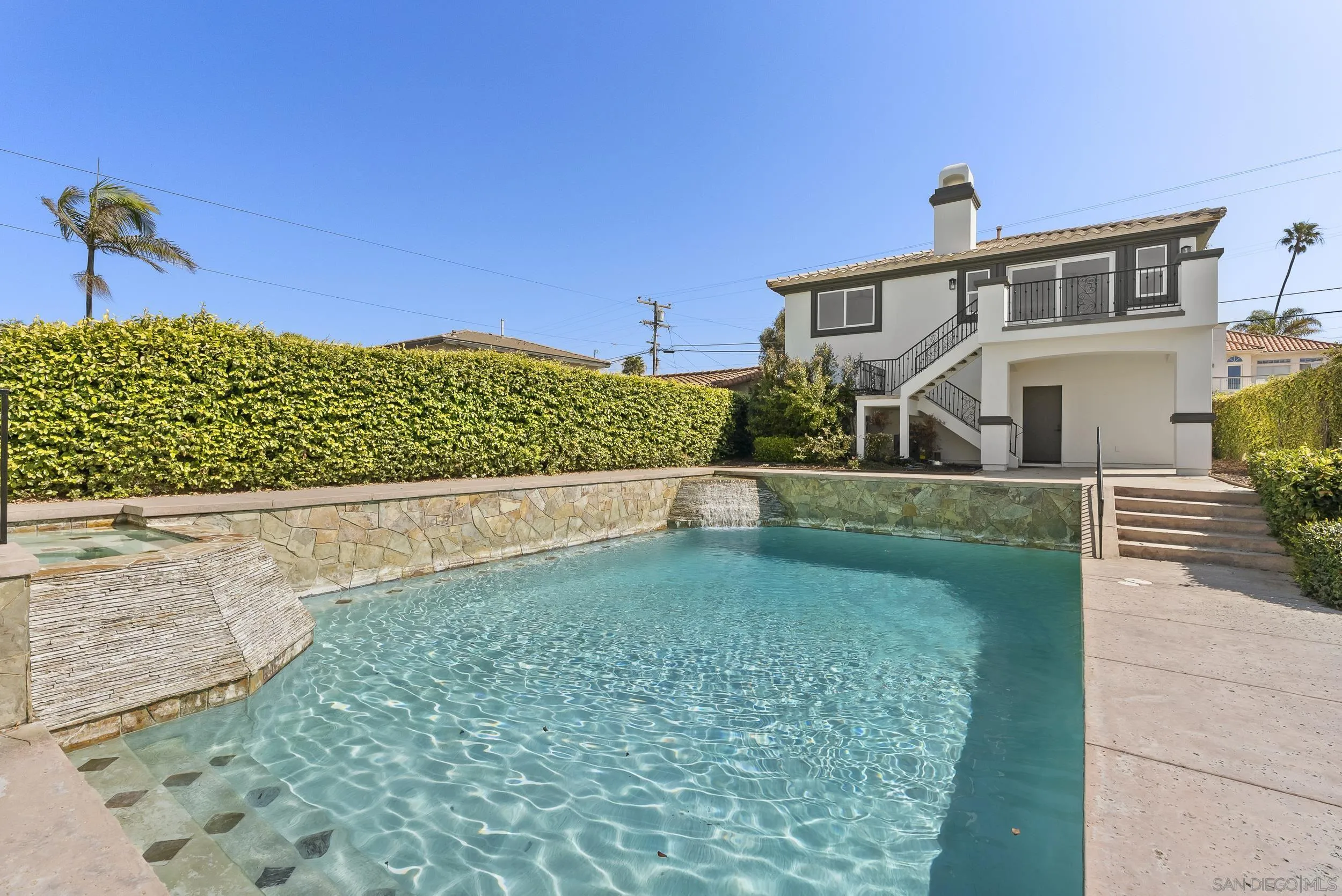 Overlooking the iconic Sunset Cliffs coastline, this Mediterranean estate captures the essence of Southern California oceanfront living. Set on nearly a quarter acre, the property features a 4,237 square foot main residence positioned to maximize sweeping coastal views, an 890 square foot detached casita above the three car garage, and a dramatic 20,000 gallon pool and spa. A soaring two story entry frames the ocean upon arrival and flows into light filled living spaces finished with 24 x 24 travertine flooring and solid core doors. The kitchen, living, and breakfast areas are oriented toward the water and include ample storage, a KitchenAid refrigerator and freezer combination, warming drawer, and solid slab bullnose countertops. A guest bedroom with backyard access, full bath, and laundry complete the main level. Upstairs offers a secondary living area with patio, bar and dining nook, two oversized guest bedrooms with new carpet, a full bath, and a spacious primary suite with dual vanities, walk in shower, soaking tub, and large walk in closet. The detached casita includes two bedrooms, a full bath, an open living space with renovated kitchen, and a teak deck with panoramic views. Outdoors, the pool and spa are surrounded by water features and mature landscaping, while tall garage doors provide added flexibility for larger vehicles.